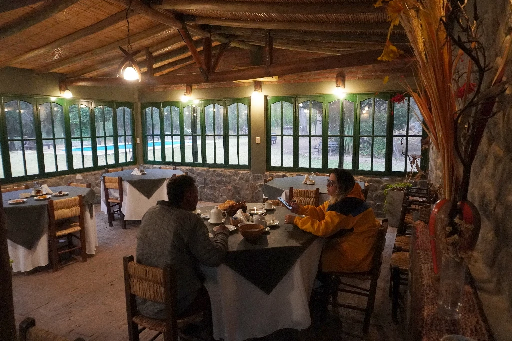 En su restaurante se brinda el desayuno, incluido en el valor de la habitación y se ofrecen almuerzos y cenas con comidas regionales, principalmente chivo, locro, asado criollo, entre otros. Tanto para quienes están hospedados en el hotel, como para quienes solo asisten al restaurante a comer y pasar un buen momento en un entorno de una belleza privilegiada.